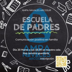 - Escuela de Padres: Acompañar a nuestros hijos hacia una mayor autonomía y responsabilidad. Charla impartida como el año pasado por La Semilla Violeta. Este año, el tema elegido es el acompañamiento a nuestros hijos hacia una autonomía y responsabilidad. - Además, para que los papas y mamas podamos estar tranquilos en la charla, volvemos a organizar nuestra guardería-ludoteca. - Será el 22 de Noviembre a las 16:30h en nuestro cole, en el aulario de infantil. La estimación de la charla es de dos horas y media. - Se ruega encarecidamente hacer buen uso de las plazas tanto de asistencia como de la guardería. Si te has inscrito y al final no puedes venir, envíanos un correo para el buen uso y organización de las mismas. Además, al igual que en las charlas trimestrales, no se admitirán peques en la guardería-ludoteca sin previa inscripción. - Charla: costeada íntegramente por Ampa Navales Arcosur, prioridad en las plazas socios de la misma. - Guardería-Ludoteca: subvencionada por Ampa Navales Arcosur, prioridad en las plazas socios de la misma. Peques en edad escolar en el centro. Plazo máximo para apuntarse día 21 a las 12h. - Socios Ampa 1€ por peque.
